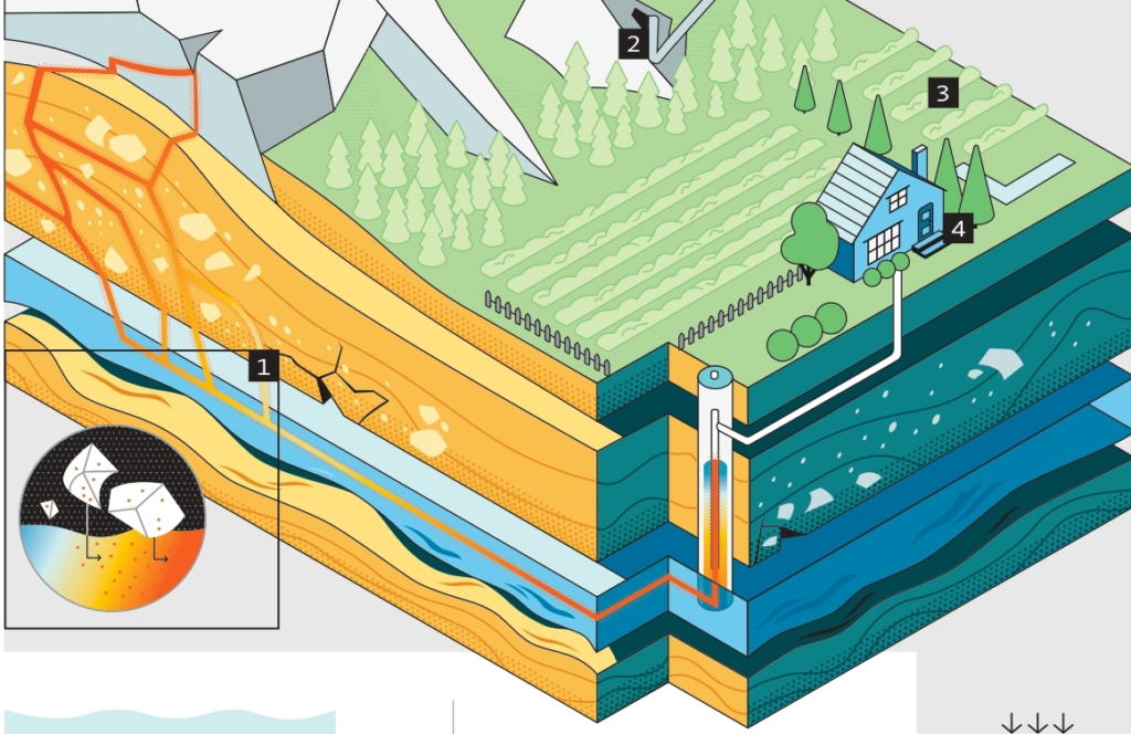 El arsénico llega al agua potable principalmente a través de procesos naturales como la meteorización de rocas volcánicas y la actividad geotermal, pero también por actividades antropogénicas como la minería y la fundición de metales.
