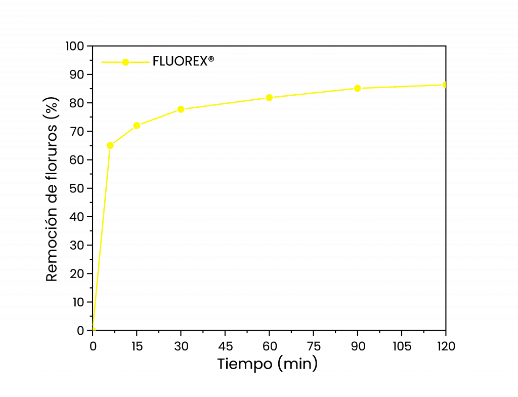 The dynamic behavior of the FLUOREX adsorbent material under standard conditions shows superior kinetics, reaching equilibrium quickly. Reaching 70% removal in just 12 minutes.
