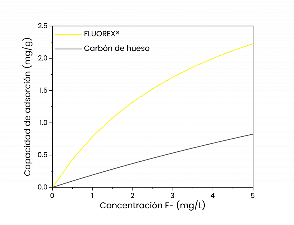 The graph above compares the performance of FLUOREX® with bone charcoal in terms of fluoride adsorption.