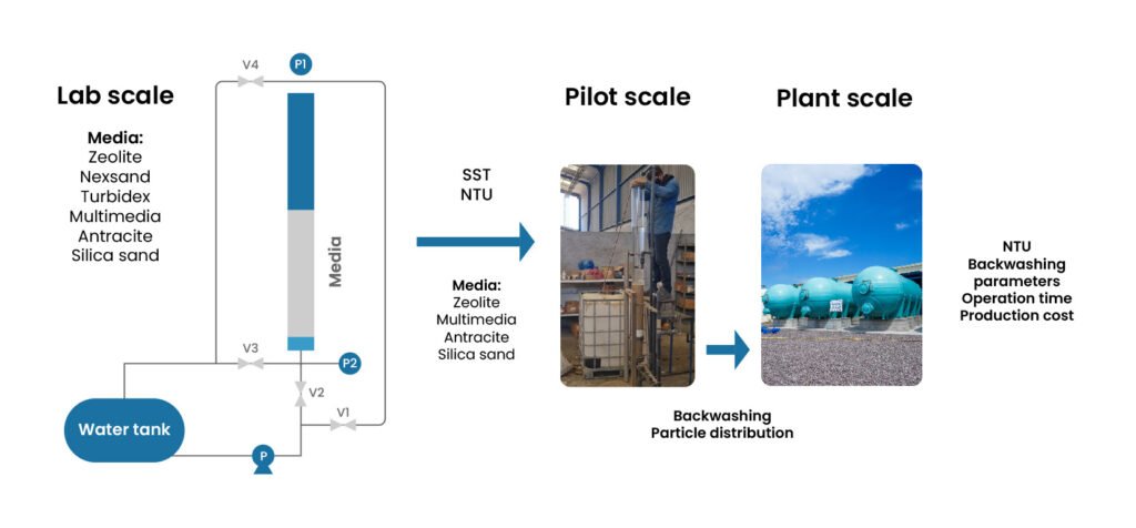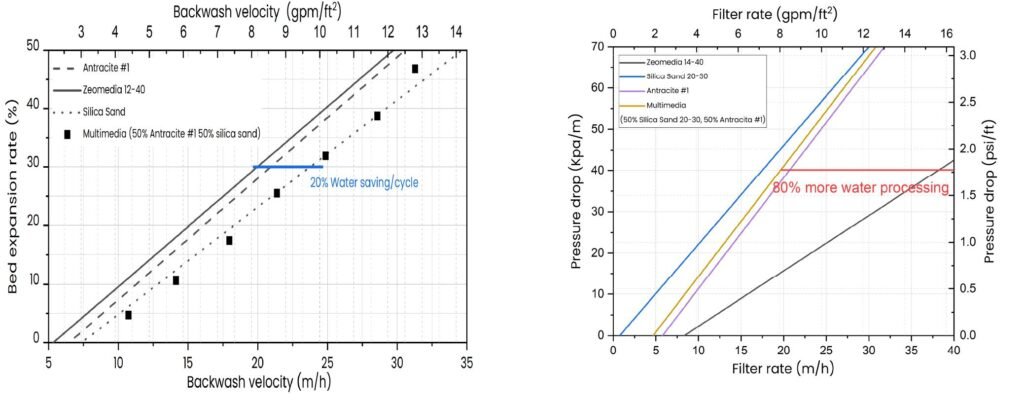 Pilot scale fluidization tests demonstrated bed expansions similar to conventional media used in desalination plants. This gives an opportunity to change the filter material for one with higher performance without major modifications in the filter backwash systems.